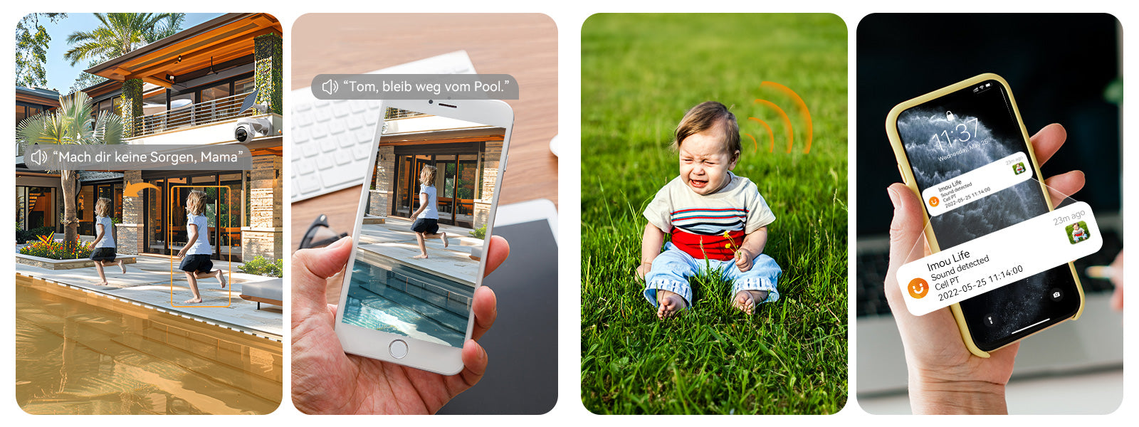 Diese Kamera bietet eine [360°-Abdeckung] für eine umfassende Überwachung Ihres Außenbereichs, sodass Sie die Spielzeit Ihrer Kinder in [Echtzeit] von jedem Smart-Gerät aus überwachen können. Mit der [intelligenten Verfolgung]stechnologie folgt sie automatisch ihren Bewegungen und warnt Sie, wenn sie sich unsicheren Bereichen nähern, die Sie voreingestellt haben. Plus, die [Zwei-Wege-Kommunikation] ermöglicht es Ihnen, klar zu sprechen, um sie aus der Gefahrenzone zu führen. Darüber hinaus benachrichtigt Sie die [Erkennung abnormaler Geräusche] unserer Kamera sofort über ungewöhnliche Geräusche, wie das Fallen oder Weinen eines Kindes, sodass Sie keinen Moment ihrer Sicherheit verpassen.