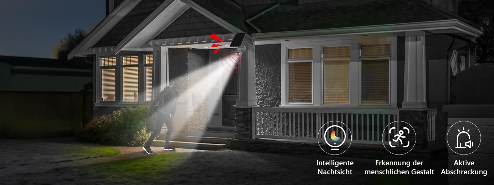 Nichts stört die Ruhe mehr als die Bedrohung durch unbefugtes Eindringen. Aber jetzt können Sie beruhigt sein, denn mit dieser Kamera wissen Sie, dass Ihr Zuhause unter wachsamer Beobachtung steht. Die [intelligente Nachtsicht] dringt durch und liefert klare Bilder von jeder Bewegung, um sicherzustellen, dass kein Winkel Ihres Grundstücks unbeobachtet bleibt. Wenn die [Personenerkennung] eine ungewöhnliche Präsenz feststellt, wird der [aktive Abschreckungs]-Mechanismus ausgelöst, der eine leistungsstarke Warnung aussendet und Blitzlichter aktiviert, um potenzielle Eindringlinge effektiv abzuschrecken.