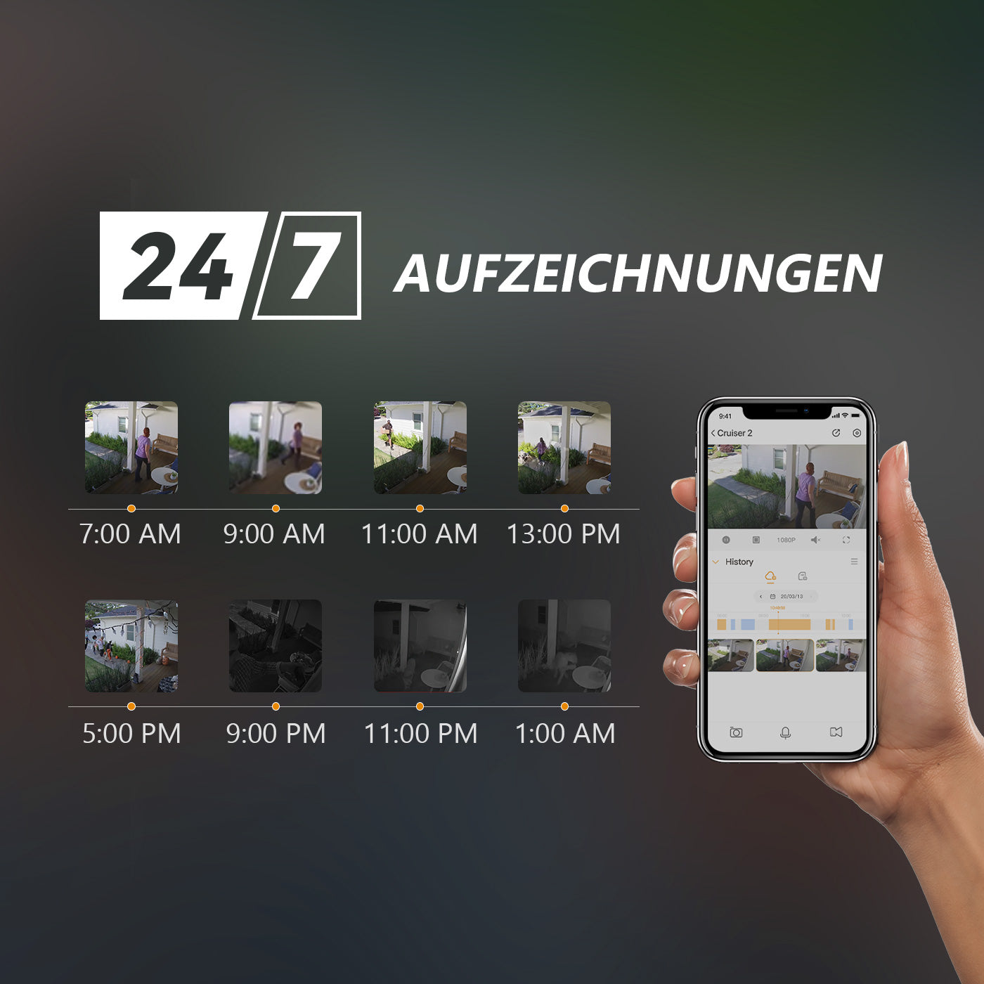 Cruiser 2 kann Autos mit einer großen Reichweite von 44 m (22 m für Menschen) identifizieren. Nicht erlaubtes Parken und Kratzer am Fahrzeug können eine sofortige Benachrichtigung an Sie auslösen und sofort ein Video aufzeichnen.