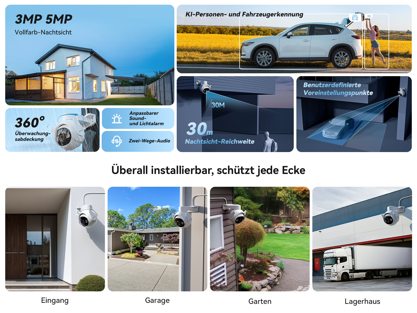 Die 5-Megapixel-Auflösung sorgt dafür, dass die Kamera scharfe Details erfassen kann, sodass Personen oder Objekte im Filmmaterial leichter zu identifizieren sind. Darüber hinaus bietet die 3K-Auflösung ein noch höheres Maß an Klarheit, sodass Benutzer besser verstehen können, was im überwachten Bereich passiert. Sie können eine verbesserte Bildqualität erwarten, die das Erkennen von Gesichtern, Nummernschildern und anderen wichtigen Details erleichtert.
