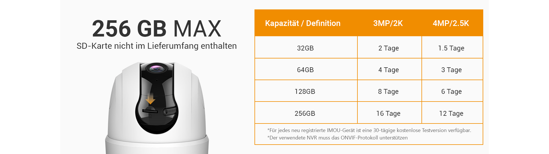 Unterstützt SD-Karten mit bis zu 256 GB (separat erhältlich), damit Sie rund um die Uhr aufzeichnen können, und bietet 30 Tage kostenlosen Cloud-Speicher.