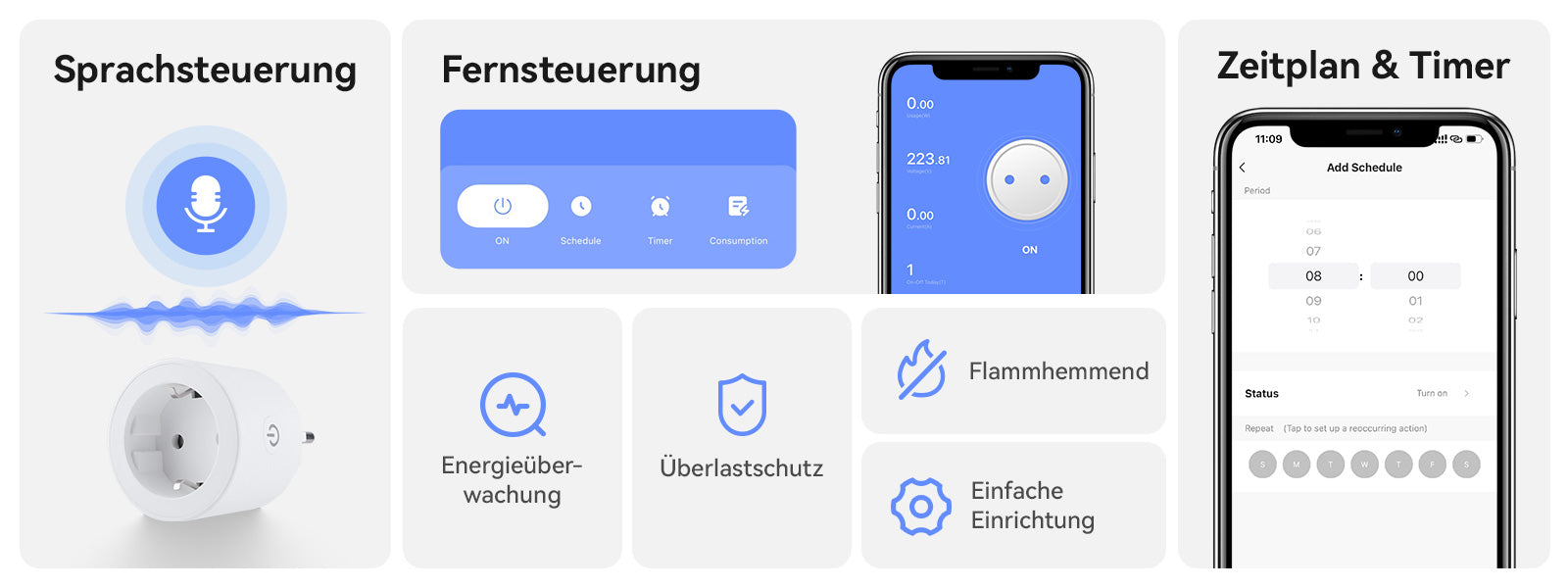Der Smart Plug bietet mühelose Integration mit Alexa, Google Home und Matter, sodass Sie Ihre Geräte nur mit Ihrer Stimme steuern können. Egal, ob Sie zu Hause oder unterwegs sind, sagen Sie einfach Befehle wie "Alexa, schalte das Licht aus" oder "Hey Google, schalte den Ventilator ein", um ein vollständig vernetztes Smart-Home-Erlebnis zu genießen. Mit der Matter-Kompatibilität verbindet sich Ihr Smart Plug nahtlos über Plattformen hinweg und stellt sicher, dass Ihre Geräte harmonisch zusammenarbeiten, unabhängig davon, welches Smart-Home-Ökosystem Sie bevorzugen.
