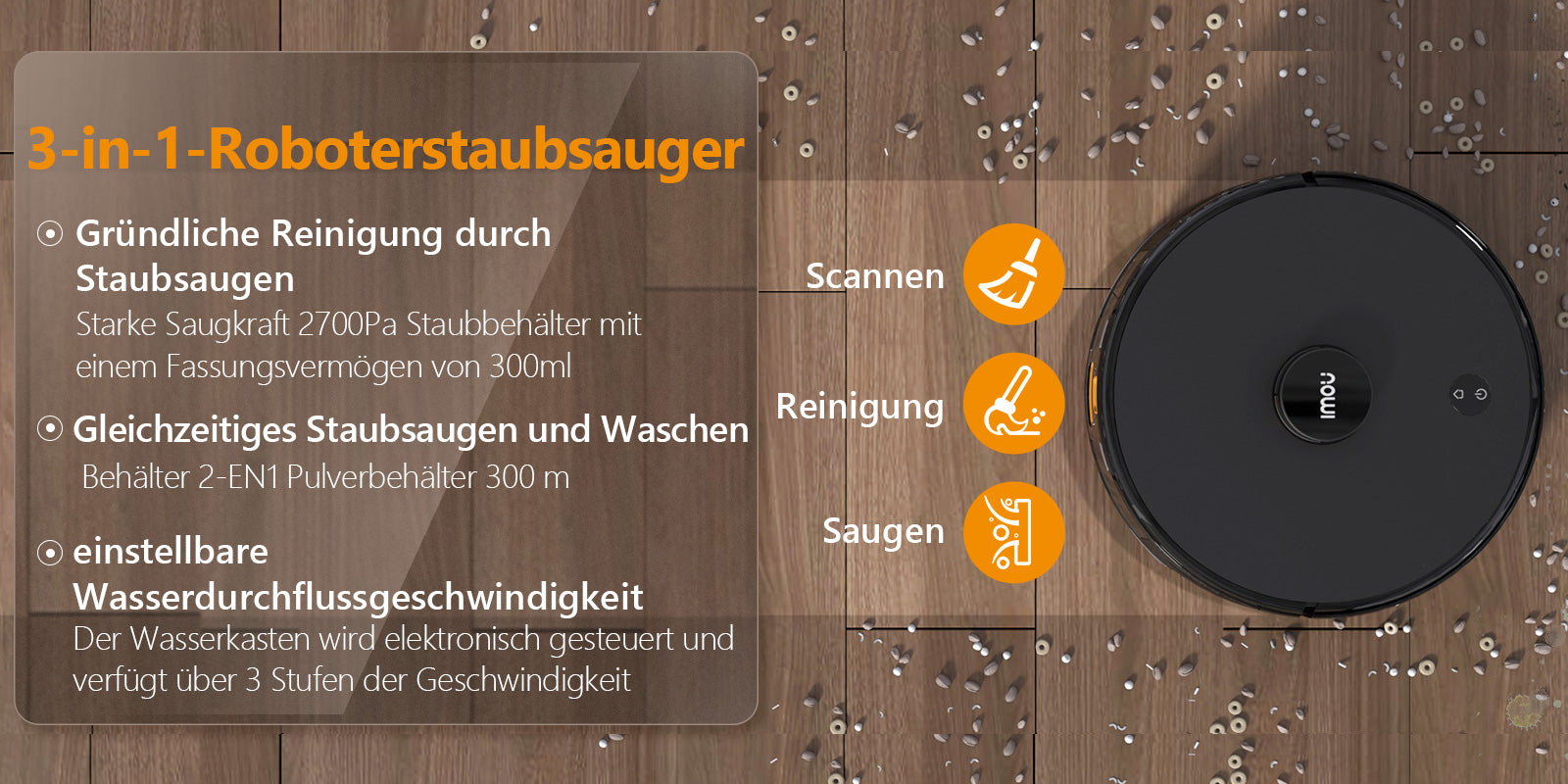 La potenza di aspirazione massima di 6500Pa (6500Pa per RV1 Pro Max e 4500Pa per L11Pro Max) rimuove facilmente la polvere dai pavimenti e raccoglie la polvere dai tappeti, aiutandovi ad affrontare polvere e detriti da tappeti, pavimenti, piastrelle, piastrelle della cucina fortemente macchiate e altro ancora.