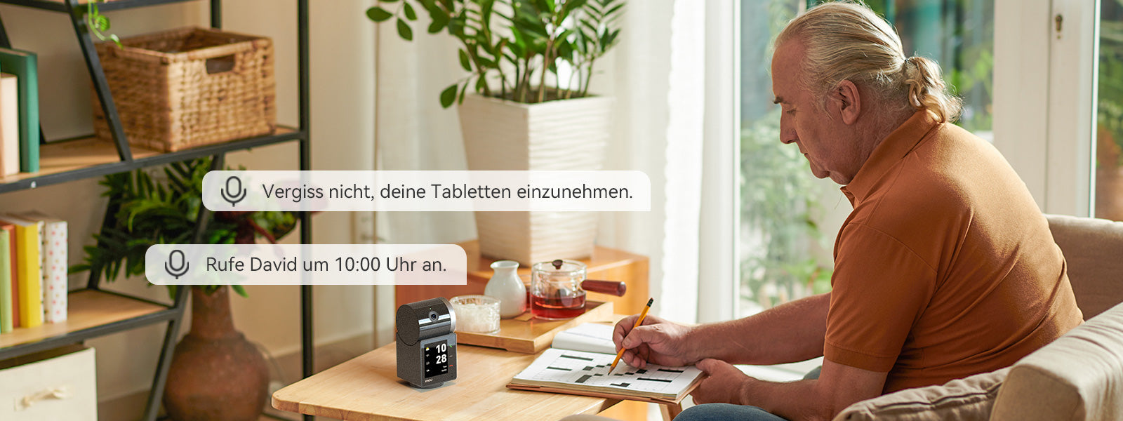 Sie können im App Sprachmemos einrichten, um Ihre Angehörigen zu Hause an Dinge zu erinnern, die sie wissen sollten. Rex VT spielt Ihre vorab aufgenommenen Audios ab, als wären Sie dort.