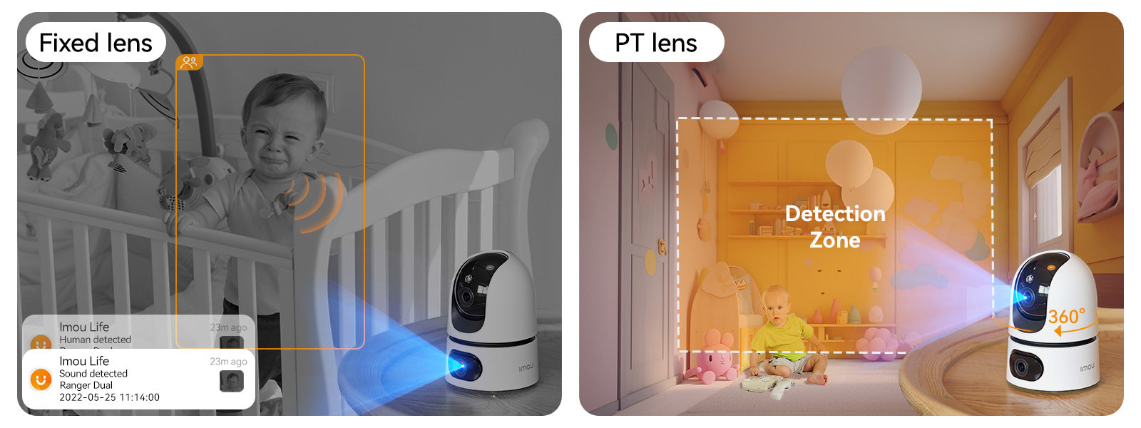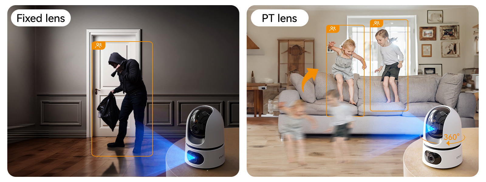 The [objectif PT] offers [suivi automatique à 360°], suivant intelligemment les enfants et les animaux qui se déplacent. Vous pouvez communiquer clairement avec votre famille ou vos animaux de compagnie à tout moment grâce à la fonction [talkie-walkie], même lorsque vous n'êtes pas chez vous. Pendant ce temps, notre [objectif fixe] monte la garde à votre entrée, constituant la première défense contre les visiteurs indésirables, vous alertant instantanément de tout accès non autorisé.