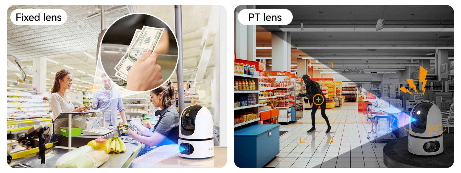Our camera is an ideal choice for both homes and small shops. The [PT lens] covers the cash register, using [human detection] to monitor for suspicious activities, whether it's customers lingering too long or unusual transactions. While the [Fixed Lens] captures transaction details with [8× digital zoom] for clear recording. With [smart night vision] for superior clarity and a [customizable alarm] system, such as pre-recorded police-siren, it ensures security in any light.
