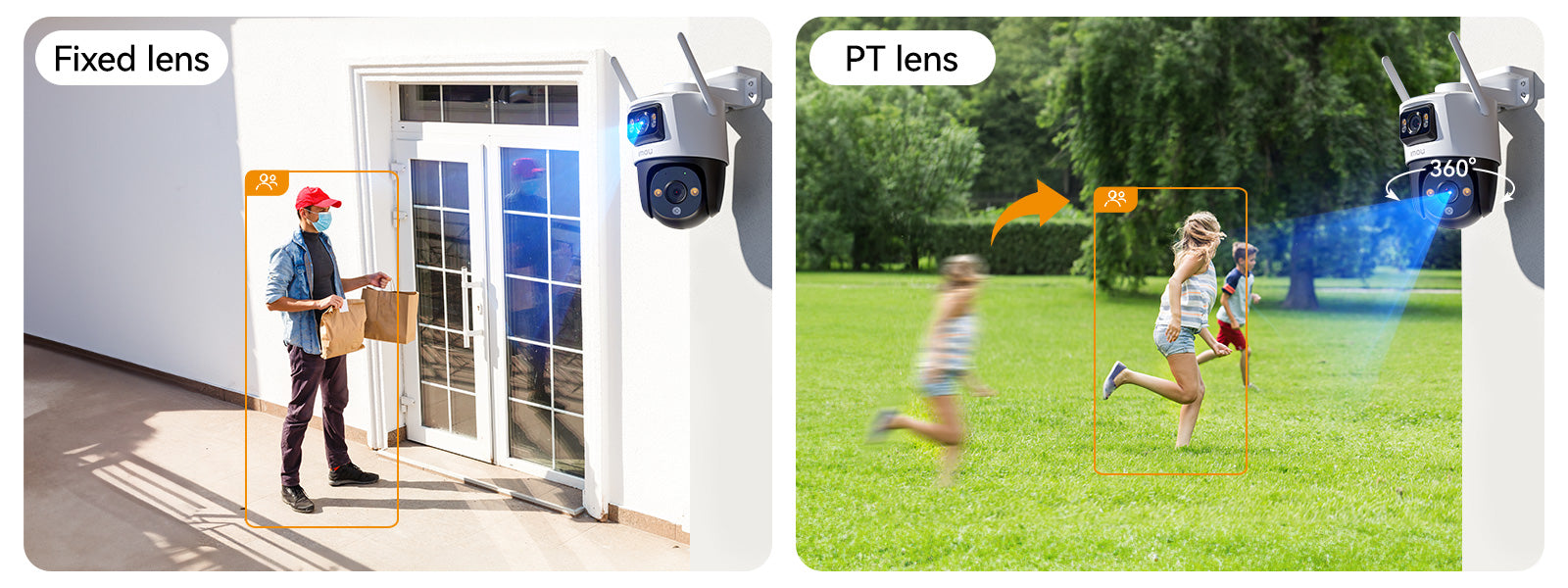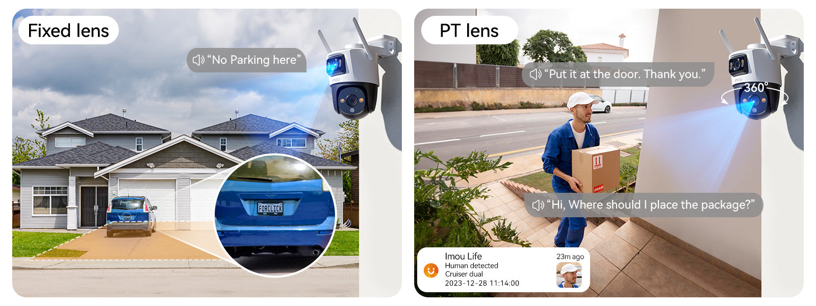 Secure your driveway with our [PT lens], [set detection zones], and [receive alerts] if unauthorized parking occurs. Our camera [detects the vehicle, triggers alarms, and notifies you instantly]. Use [8x digital zoom] to inspect details or review incidents. The [Fixed lens] guards your house doorway, ensuring you never miss an important delivery with its [human detection] feature. Whether it's signing for a package or conversing with visitors, this camera allows you to respond instantly.