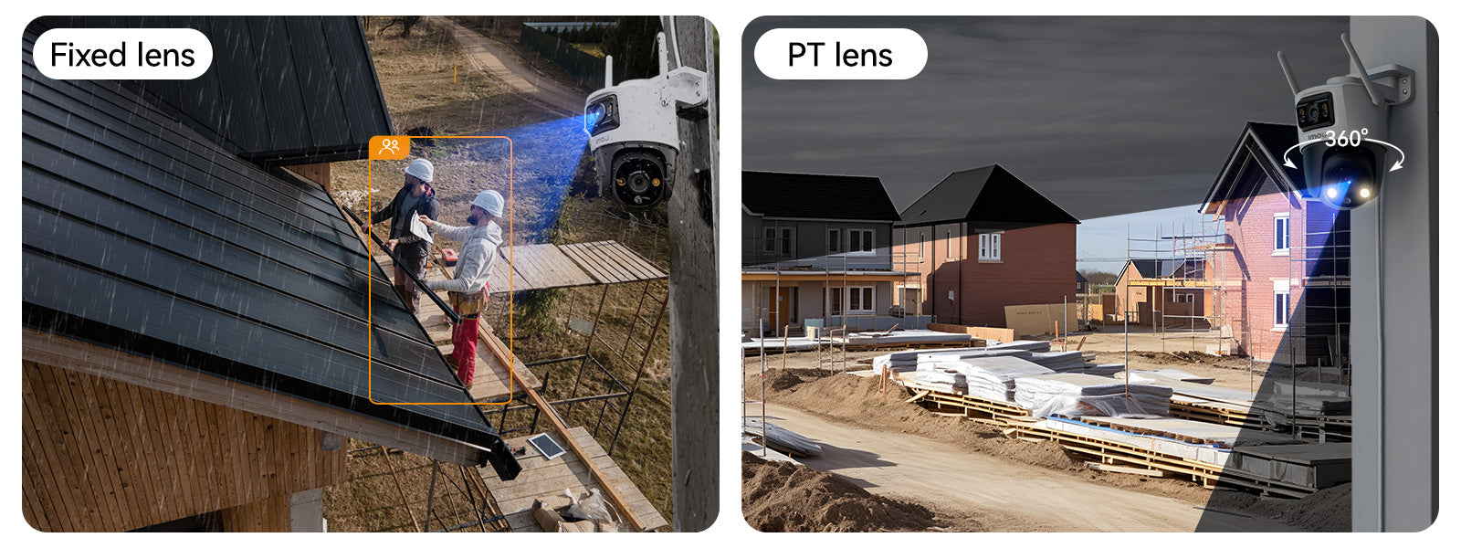 This camera's [IP66 waterproof] rating keeps it unfazed by any harsh weather, providing [24/7 real-time surveillance]. The [PT Lens] covers the perimeter and adjacent areas with a broad view. When a worker accidentally damages your property is detected by [abnormal sound detection] function, this camera will store the entire process as evidence for a claim against the worker. The [Fixed Lens], aimed at the storage area for construction materials, uses its [smart night vision] to expose any theft attempts in the dark. When strangers is ready to steal property, the camera immediately [activates a deterrent mechanism], flashing lights and alarms to effectively scare off intruders.