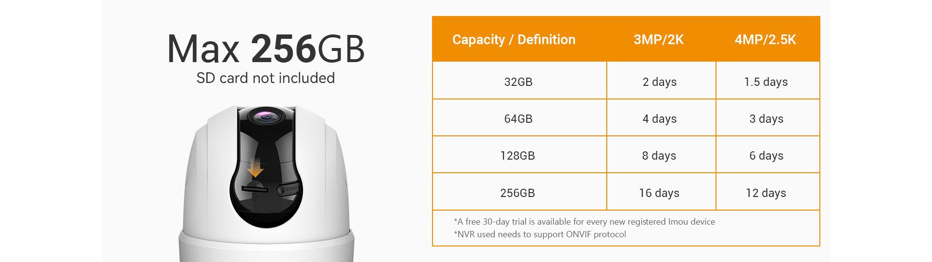 Support up to 256GB SD card (sold seperately) so you can do 24/7 recording and provide 30-day free cloud storage.