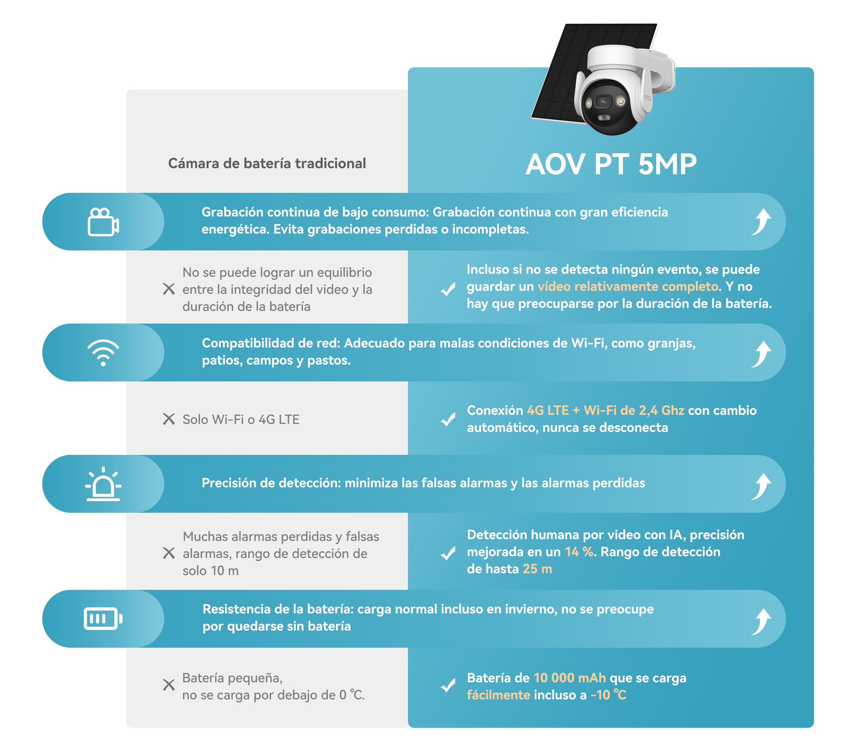 Basado en la tecnología AOV, el AOV PT tiene un rango de detección mucho más largo que las cámaras comunes con batería, de hasta 25 metros, sin falsas detecciones debido a imprecisiones del PIR.