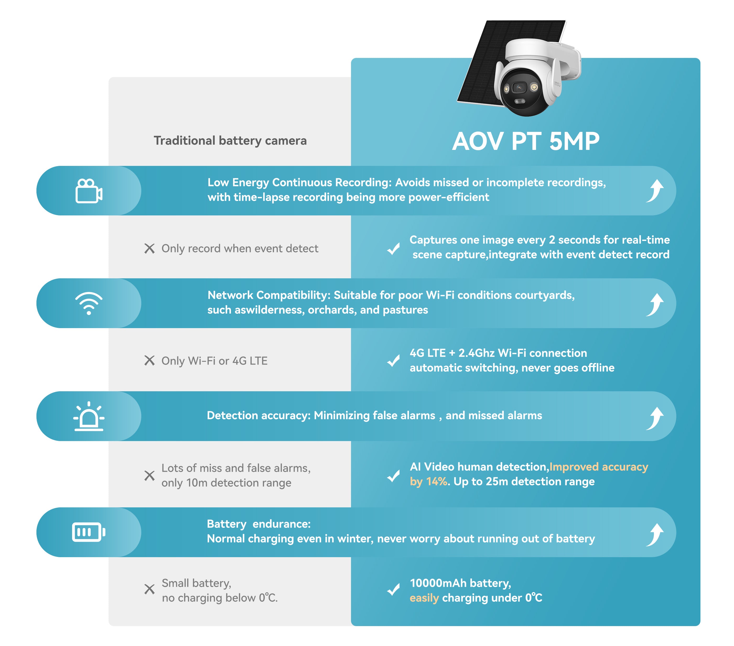 Basada en la tecnología AOV, la AOV PT tiene un rango de detección mucho más largo que las cámaras de batería comunes, hasta 25 metros, sin detecciones falsas debido a imprecisiones de PlR.