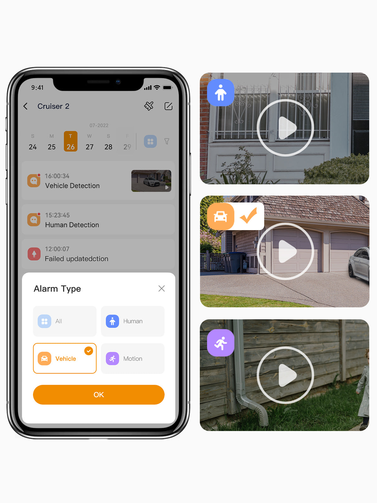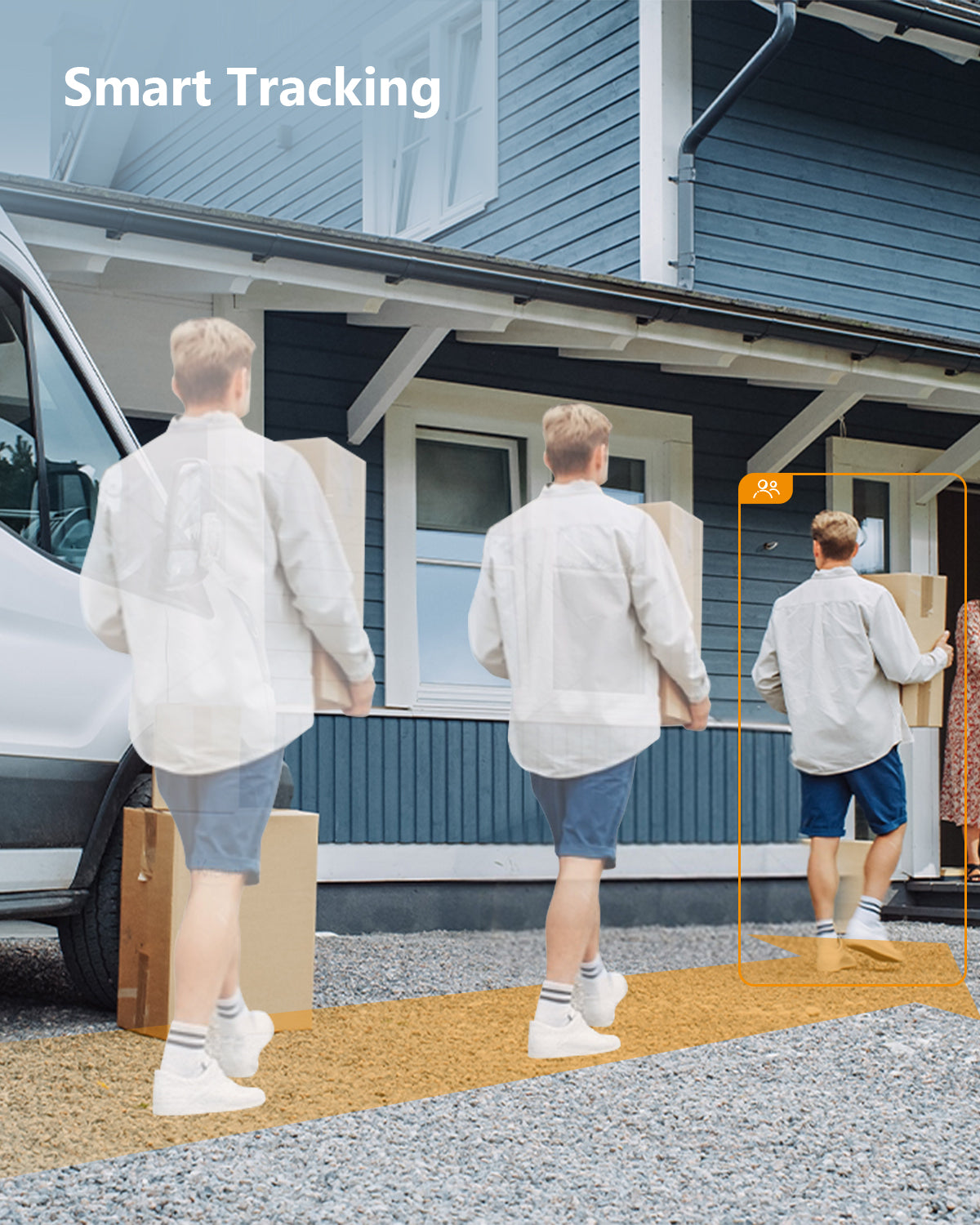 Detecte y diferencie entre personas, animales y vehículos, reduciendo el número de falsas alarmas y notificaciones. Esto evitará que lo bombardeen con alertas irrelevantes y les ahorrará tiempo y esfuerzo al monitorear sus grabaciones. Además, con la detección por IA, puede configurar alertas personalizadas para eventos específicos, como recibir notificaciones solo cuando una persona entra en la propiedad. Esta función mejora la capacidad de la cámara para detectar posibles intrusos o actividades sospechosas y le brinda mayor tranquilidad.