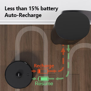 Cuando el nivel de potencia sea inferior al 15 %, el robot aspirador se cargará automáticamente; tras una carga del 80 %, continuará con la última limpieza y recogerá el polvo automáticamente.