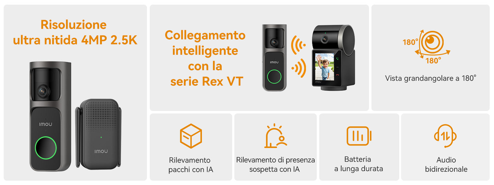 Inoltre, gli avvisi di movimento e la suoneria del campanello sono sincronizzati con Rex VT, garantendo che tutta la famiglia sia sempre informata e connessa alle attività che si svolgono vicino alla porta.
