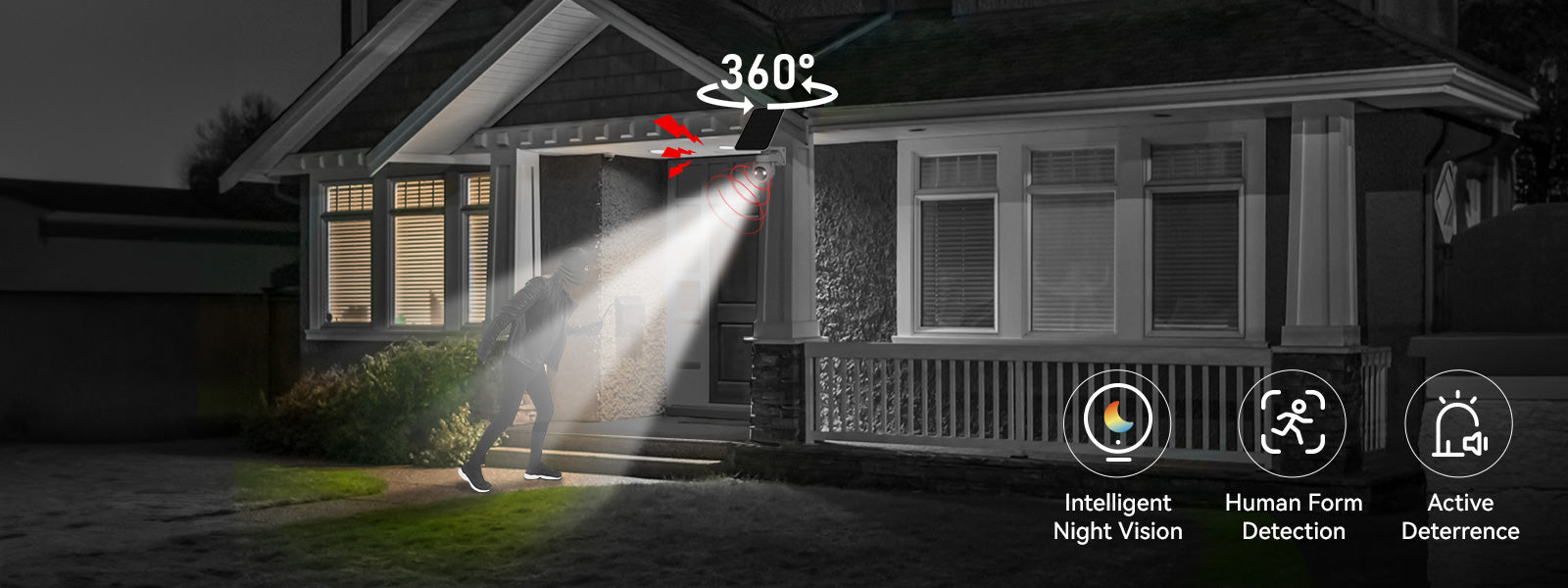 Quando non sei a casa, una figura sospetta appare improvvisamente fuori dalla tua abitazione. Questa telecamera [Vista panoramica a 360°] E [Funzione di tracciamento intelligente] può identificare e agganciare immediatamente il bersaglio, mantenendolo al centro del suo campo visivo indipendentemente da come si muove. Quando cala la notte,[Funzione di visione notturna intelligente] si attiva automaticamente per catturare chiaramente ogni dettaglio. E se una persona sospetta cerca di avvicinarsi, la telecamera [Funzione di deterrenza attiva] emetterà un suono di avvertimento e un riflettore, bloccando efficacemente le potenziali minacce.