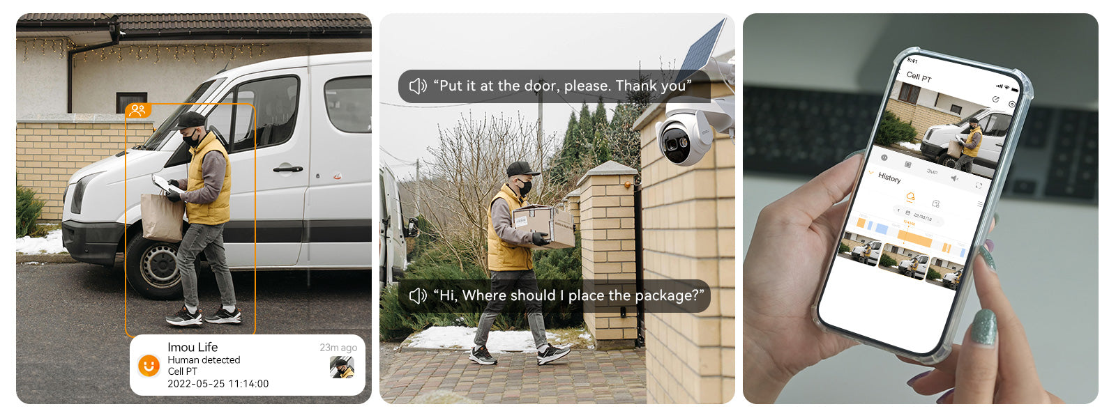 Quando il corriere arriva a casa tua e tu non sei in casa, la nostra telecamera di sorveglianza intelligente [con rilevamento umano] può riconoscere con precisione l'arrivo del corriere e avvisarti in tempo. Attraverso il [discorso bidirezionale] Grazie alla funzione, anche se sei lontano, puoi comunicare in tempo reale con il corriere e guidarlo nel posizionamento sicuro del pacco.
