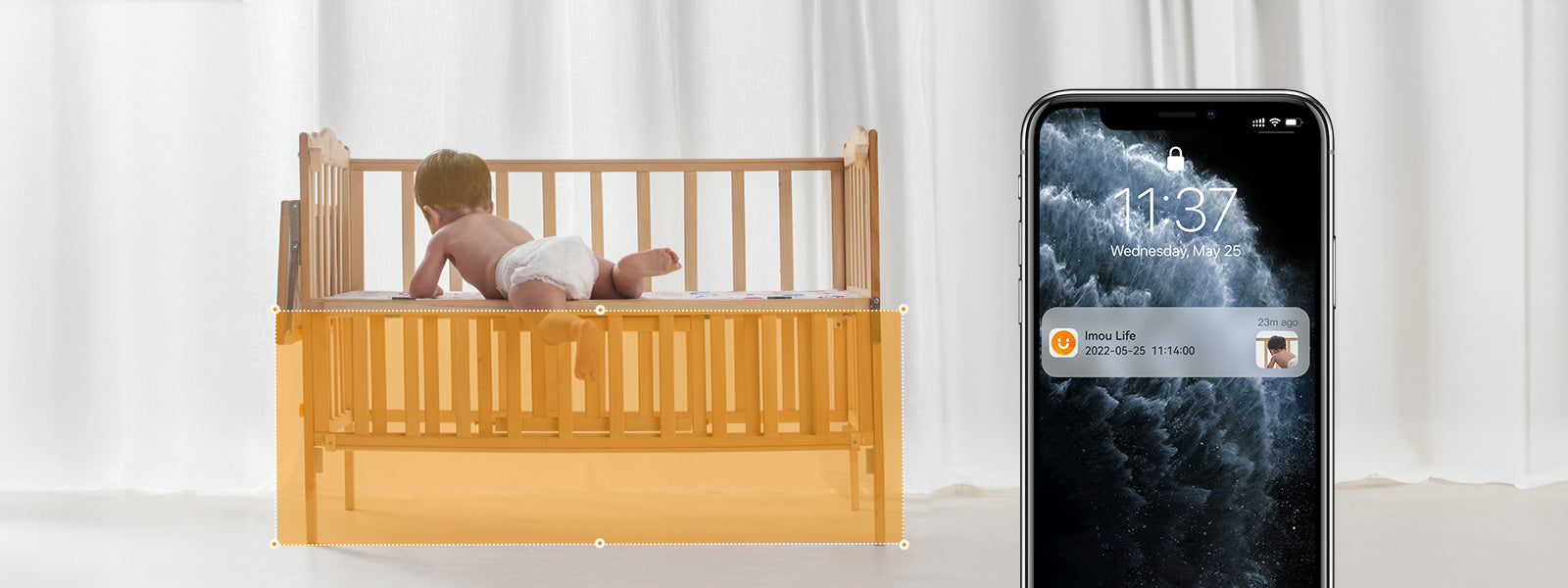 Puoi [personalizzare l'impostazione dell'area di monitoraggio] in base alla disposizione della cameretta dei bambini. Quando il bambino entra in una zona non sicura, ad esempio cadendo dal letto, la telecamera invierà immediatamente un [notifica di allarme]al tuo cellulare phone.When il tuo bambino si sveglia, puoi calmarlo con il [discorso bidirezionale] funzione.