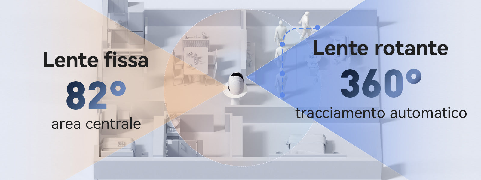 L'obiettivo doppio regolabile da 3MP/4MP del Ranger 2C Dual offre una protezione a 360°. L'obiettivo pan-tilt da 3MP/4MP supporta una rotazione orizzontale di 0°-355° e una rotazione verticale di -5°-80°, mentre l'obiettivo fisso supporta una rotazione verticale di 15°, garantendo una copertura completa per la tua casa.
