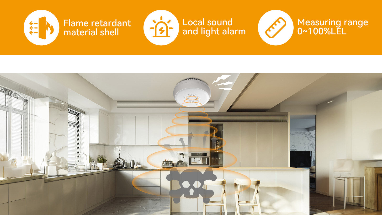 Durante la cottura in cucina, una perdita imprevista di gas naturale può accumularsi silenziosamente, rappresentando un potenziale rischio per la sicurezza. L'allarme rilevatore di gas adotta un sensore di gas avanzato a bassa corrente e un modulo di compensazione della temperatura integrato, in grado di rilevare tempestivamente minuscole molecole di gas combustibile nell'aria, inviare con precisione un segnale di allarme acustico e visivo (85 decibel) e trasmetterlo all'APP.