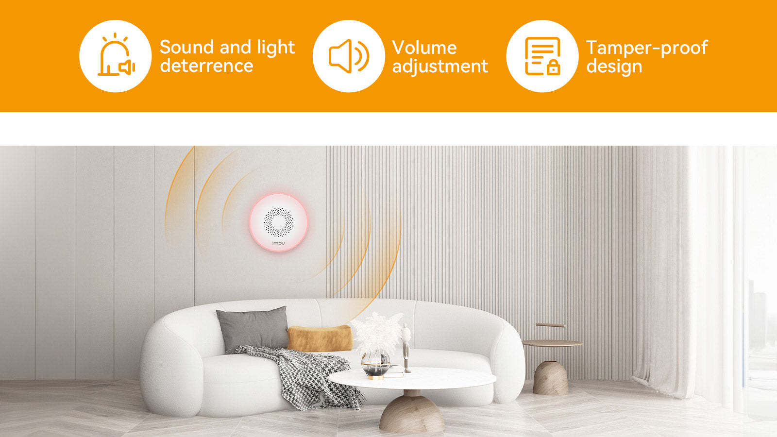 Per migliorare la sicurezza della tua casa, la sirena d'allarme IMOU è la soluzione di backup perfetta quando gli allarmi principali sono lontani da te o per chi ha difficoltà di udito, garantendo una rapida notifica di qualsiasi violazione della sicurezza. Funge anche da formidabile deterrente per gli intrusi, con il suo allarme acustico e visivo (max 85 dB).