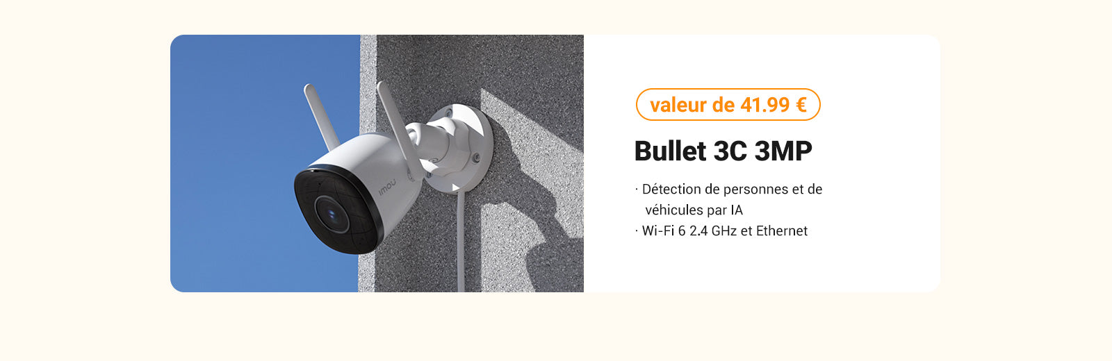 - Dépensez 300 € : Recevez une caméra à batterie Bullet 3C 3MP..