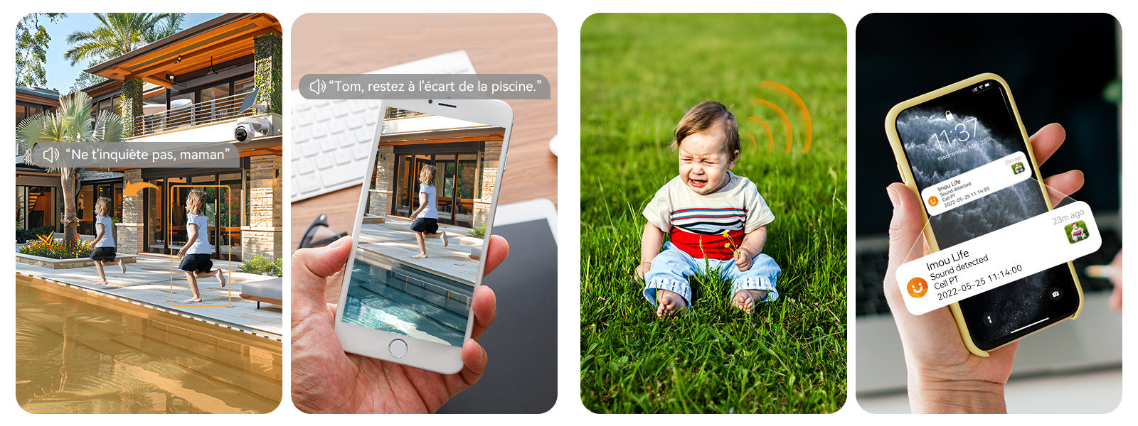 Cette caméra offre une fonction [Couverture à 360°] pour une couverture complète de votre espace extérieur, vous permettant de surveiller le temps de jeu de vos enfants en [temps réel] depuis n'importe quel appareil intelligent. Grâce à la technologie [suivi intelligent], il suit automatiquement leurs mouvements et vous alerte s'ils s'approchent de zones dangereuses que vous avez prédéfinies. De plus, la [audio bidirectionnel] vous permet de parler avec clarté pour les éloigner du danger. De plus, la [détection des sons anormaux] de notre caméra vous avertit immédiatement de tout son inhabituel, comme la chute ou les pleurs d'un enfant, vous assurant de ne jamais manquer un moment de sa sécurité.