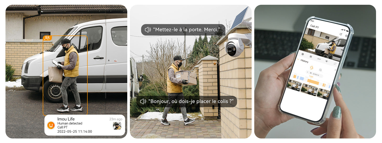 Equipé de [détection humaine], il identifie avec précision l'arrivée d'un coursier et vous alerte rapidement. Que vous soyez chez vous ou non, la fonction [audio bidirectionnelle] vous connecte instantanément pour une conversation en temps réel, vous permettant de guider le livreur pour placer votre colis en toute sécurité. Chaque moment de livraison important est capturé et peut être [stocké en toute sécurité]. Cela garantit que vous pouvez vérifier et confirmer la livraison à votre convenance, offrant ainsi une expérience de réception de colis sans tracas.
