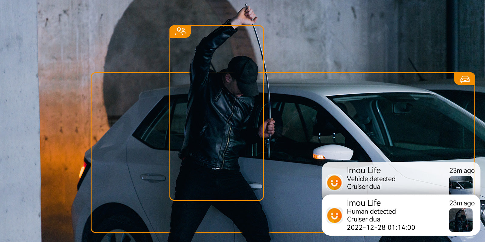 Cruiser Dual peut rapidement trouver des cibles humaines/véhicules/mouvements dans les images et envoyer immédiatement une notification à votre smartphone. En outre, Cruiser Dual peut déclencher une sirène d'alarme locale en cas de détection d'un événement anormal, par exemple lorsque quelqu'un s'approche de votre voiture ou que d'autres véhicules bloquent la sortie du garage.