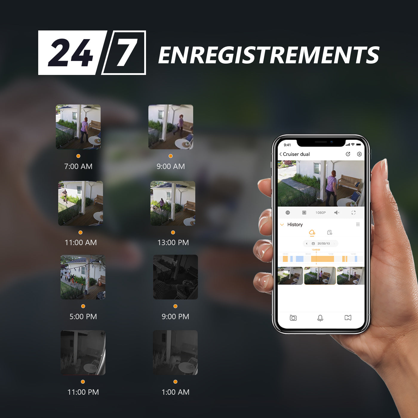 Cruiser Dual prend en charge l'enregistrement continu 24 heures sur 24, 7 jours sur 7, pour ne rien manquer.