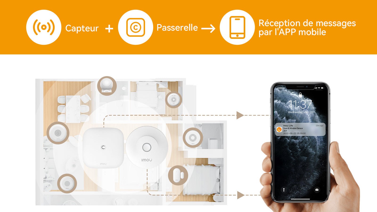 La passerelle intelligente est le centre de contrôle du système d'alarme de sécurité. Pour fonctionner correctement, tous les capteurs IMOU doivent être connectés à une passerelle. Les utilisateurs peuvent ajouter, gérer et contrôler des capteurs Zigbee via la passerelle. Les messages d'alarme des capteurs sont transmis par la passerelle à la plateforme cloud IMOU, puis transmis à l'application utilisateur. La passerelle peut déclencher une alarme lorsqu'un capteur détecte une anomalie.