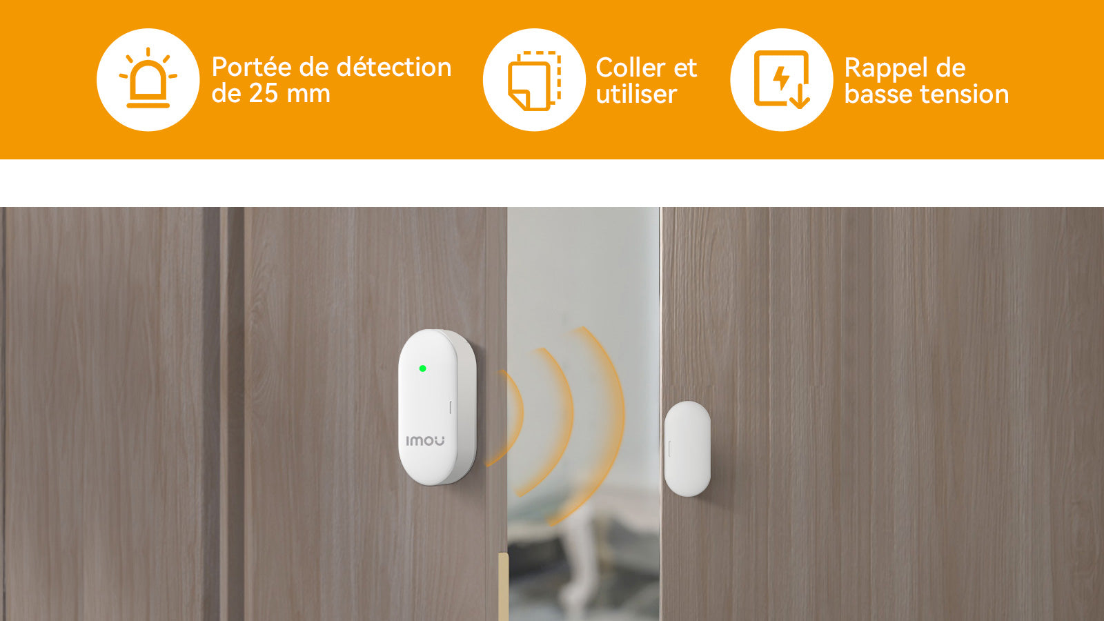 Lorsque vous n'êtes pas chez vous, il est primordial d'assurer la sécurité des biens de IMOU. Le capteur de porte et de fenêtre IMOU vous offre la tranquillité d'esprit en surveillant l'état des portes, des fenêtres, des portes d'armoires et des tiroirs. Si l'un de ces éléments est laissé ouvert, le capteur vous alertera immédiatement en envoyant un message d'alarme à l'application mobile IMOU via la passerelle. De plus, il peut être intégré de manière transparente à une caméra IMOU pour capturer et enregistrer tout mouvement anormal de porte ou de fenêtre.
