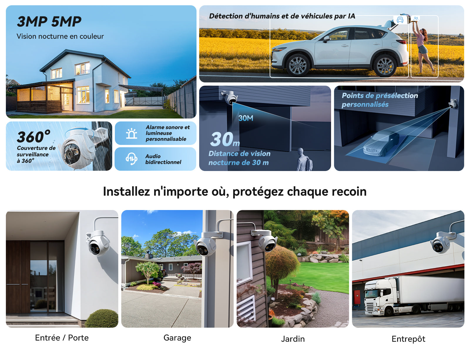 La résolution de 5 mégapixels permet à la caméra de capturer des détails précis, ce qui facilite l’identification des personnes ou des objets dans les images. De plus, la résolution 3K offre un niveau de clarté encore plus élevé, ce qui permet aux utilisateurs de mieux comprendre ce qui se passe dans la zone surveillée. La qualité de l’image est améliorée, ce qui facilite l’identification des visages, des plaques d’immatriculation ou d’autres détails importants.