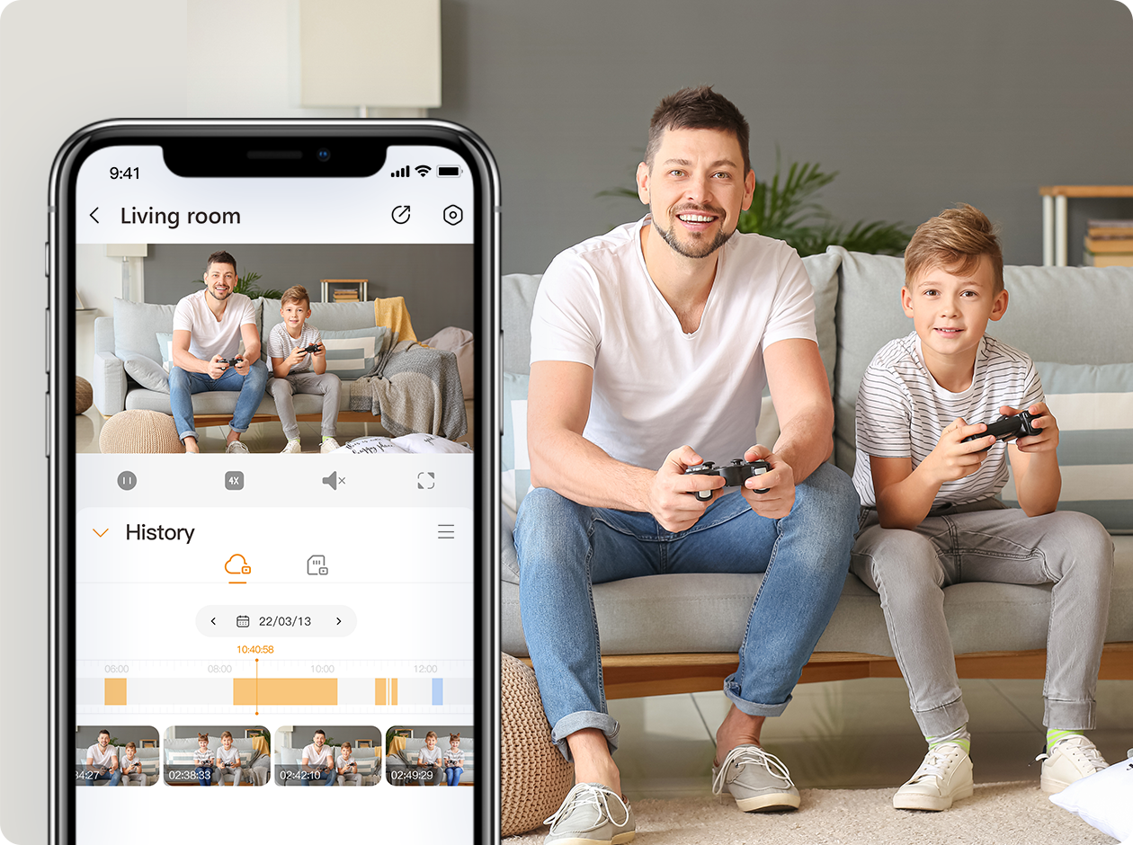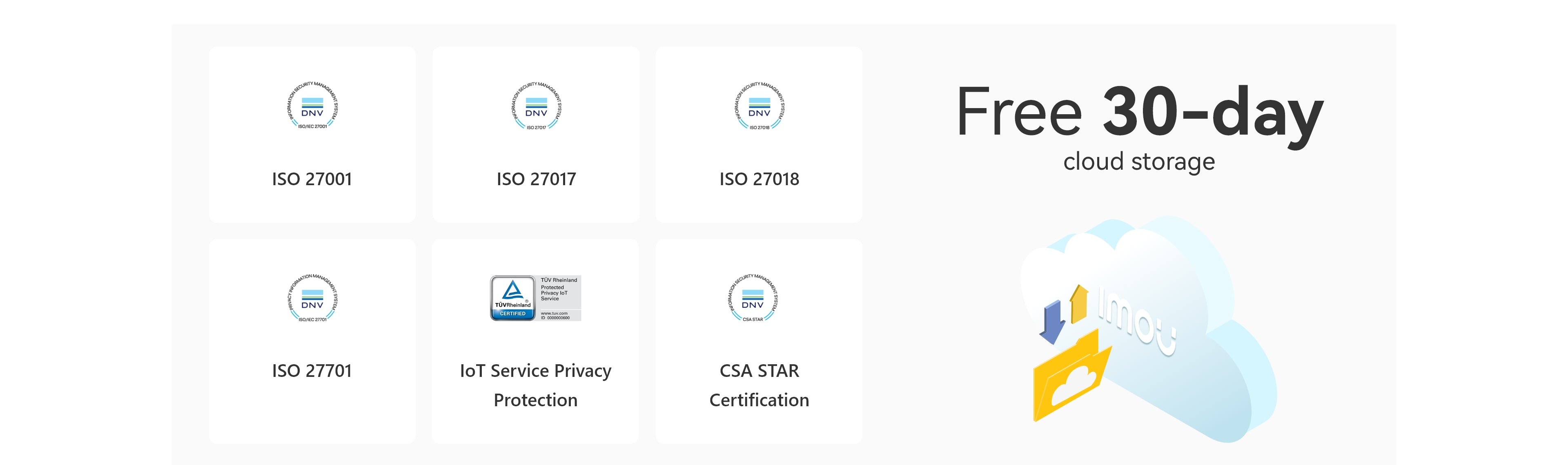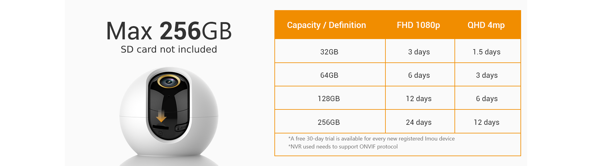 Prend en charge une carte SD jusqu'à 256 Go (vendue séparément) pour que vous puissiez effectuer un enregistrement 24h/24 et 7j/7 et bénéficier d'un stockage cloud gratuit pendant 30 jours.