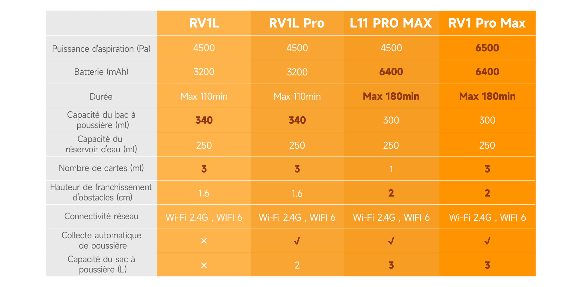 La puissance d'aspiration maximale de 6500Pa (6500Pa pour le RV1 Pro Max et 4500Pa pour le L11 Pro Max) permet de dépoussiérer facilement les sols et de ramasser la poussière des tapis, ce qui vous aide à éliminer la poussière et les débris des tapis, des sols, des carrelages, des carreaux de cuisine très tachés et bien d'autres choses encore.