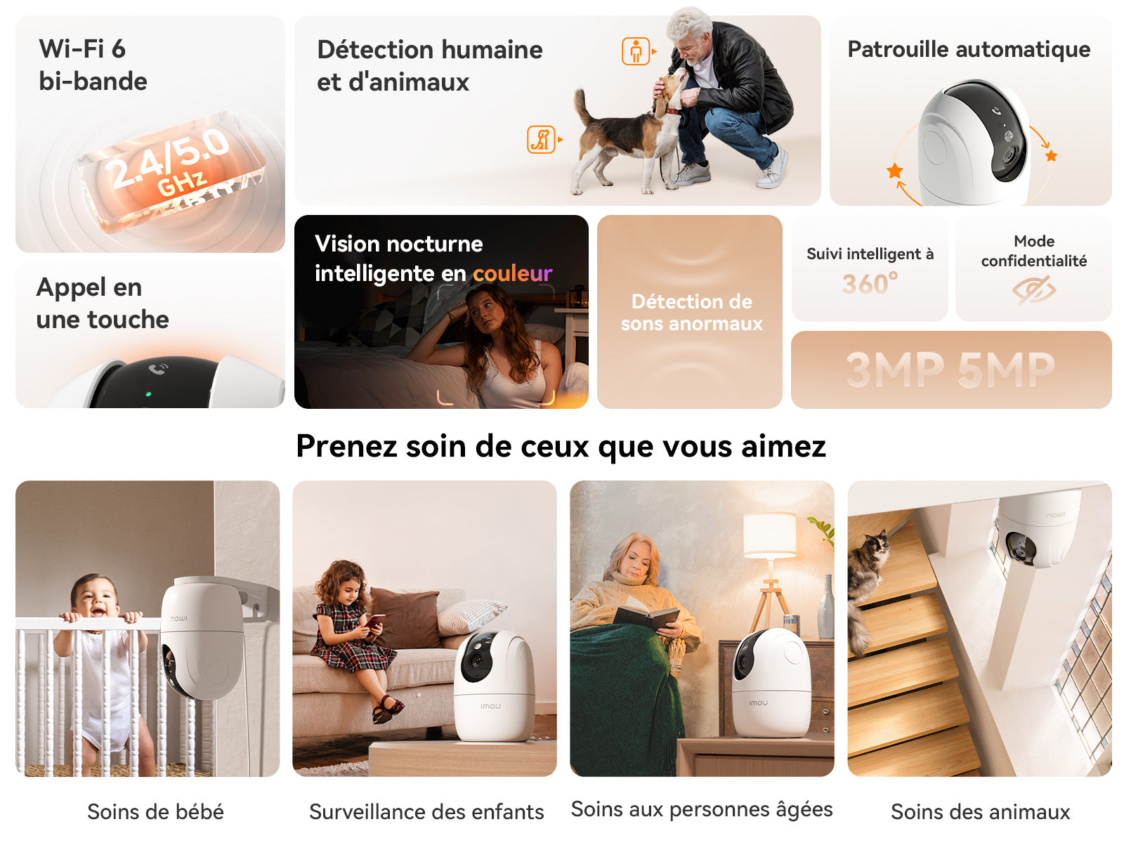 Équipée de capteurs avancés de 3MP 5MP, la Ranger 2C Pro offre une qualité vidéo exceptionnelle, de jour comme de nuit. Elle dispose de quatre modes de vision nocturne intelligents, dont le mode couleur pour une surveillance nocturne éclatante et le mode infrarouge pour une surveillance discrète. De plus, ses capacités de panoramique de 0° à 355° et d'inclinaison de -5° à 80° garantissent une couverture complète, un suivi fluide des mouvements et l'élimination des angles morts pour une protection complète.